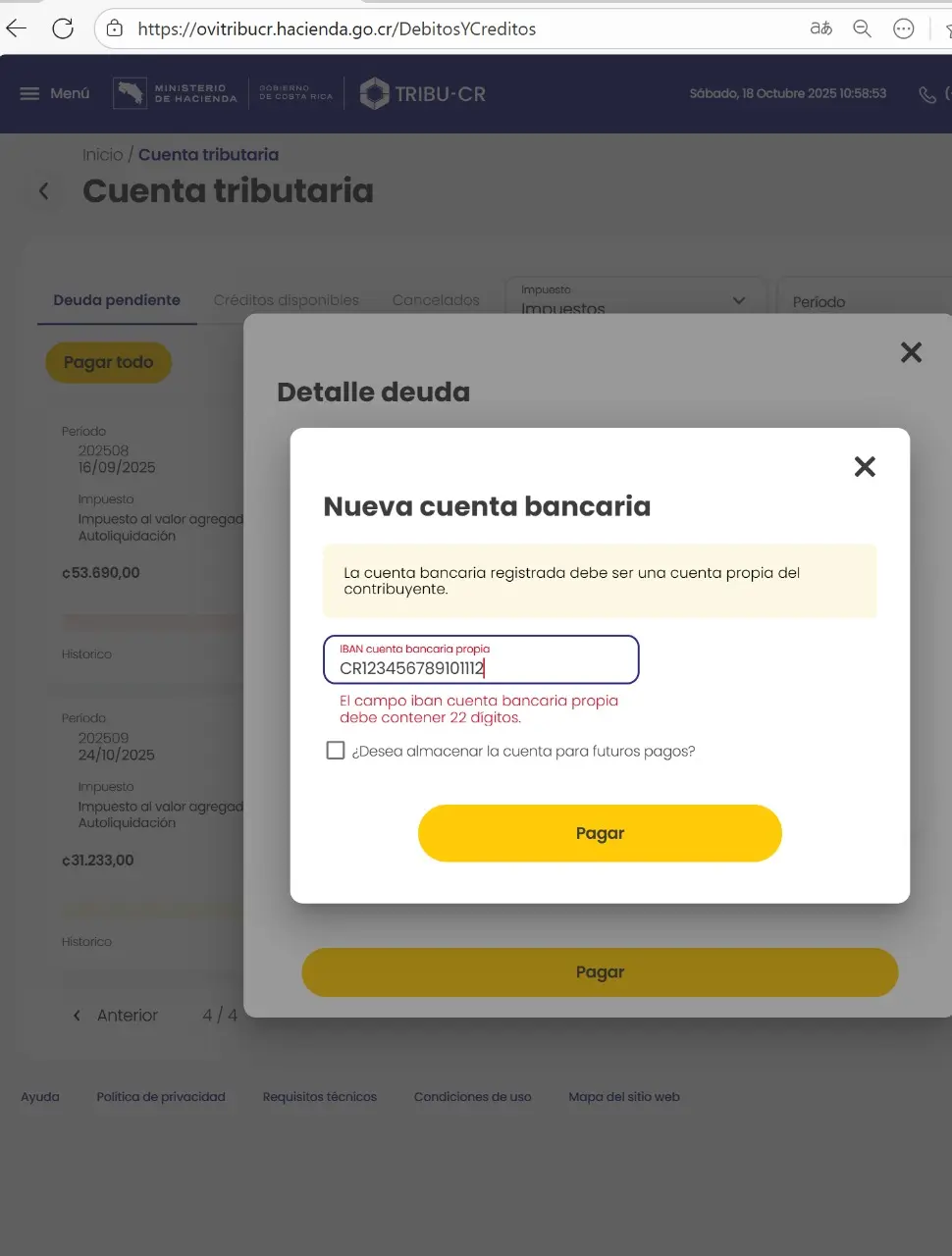 4- Digitar el numero de cuenta IBAN a pagar y dar click al botón pagar.